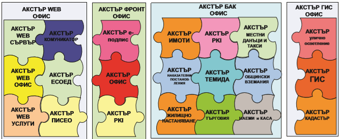 АКСТЪР МЕСТНИ ДАНЪЦИ И ТАКСИ е нов член на фамилията, който стратира работата си от началото на 2009 г. Системата има за задача да мигрира съществуващите данни и да осигури работата на съответните отдели. В групата АКСТЪР ФРОНТ ОФИС се включват корпоративната система за електронен документооборт с възможости за управление на административните процеси и управление на качеството- АКСТЪР ОФИС, модула за електронно подписване на документи АКСТЪР е-подпис и системата за предоставяне на ведомствени цифрови подписи на служителите АКСТЪР PKI. В групата АКСТЪР ГИС ОФИС се включват: